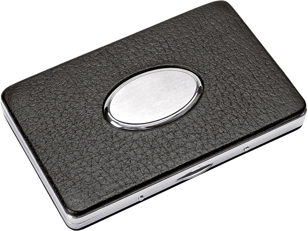 На лицевой стороне расположена овальная металлическая вставка (размер 38х23 мм). Визитница вмещает 10 визиток. Визитница открывается и закрывается посредством пружины