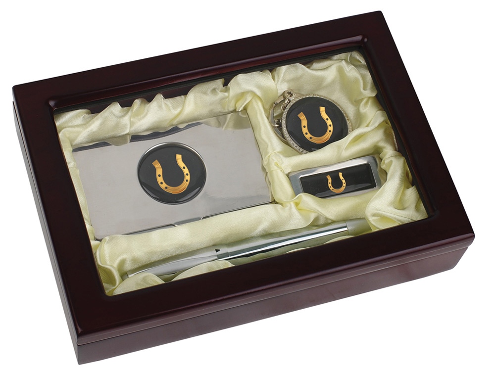 Отличным новогодним подарком будет набор аксессуаров «Год Лошади». В набор входят стильная визитница, зажим для денег, авторучка и брелок. На каждый аксессуар нанесено изображение символа года. Набор упакован в подарочную коробку. Будет отличным подарком для деловых людей.