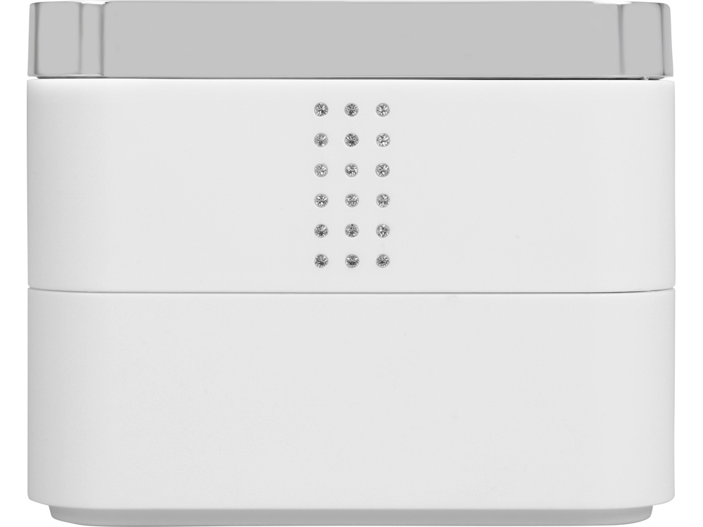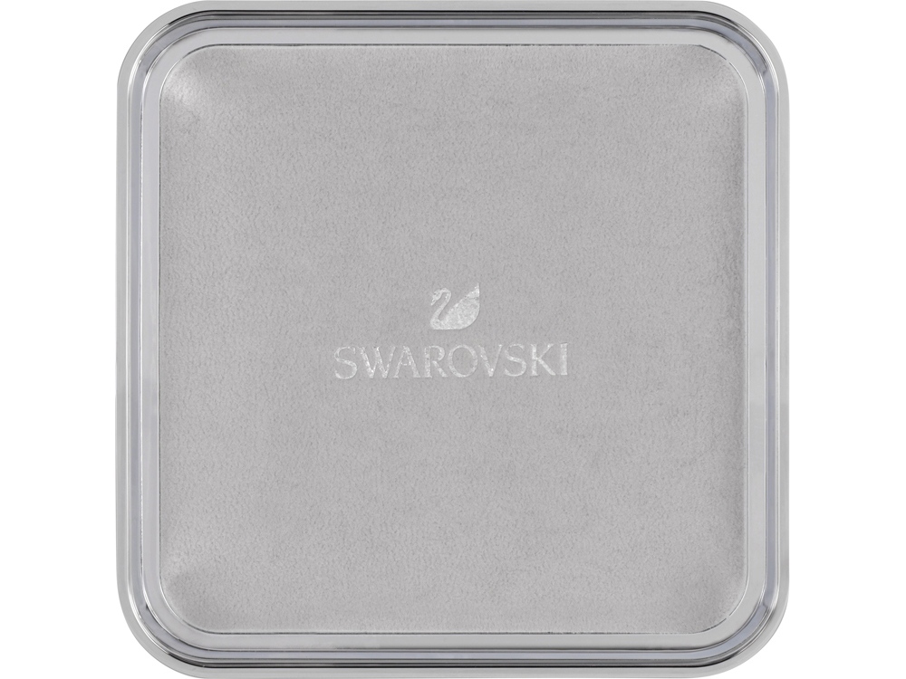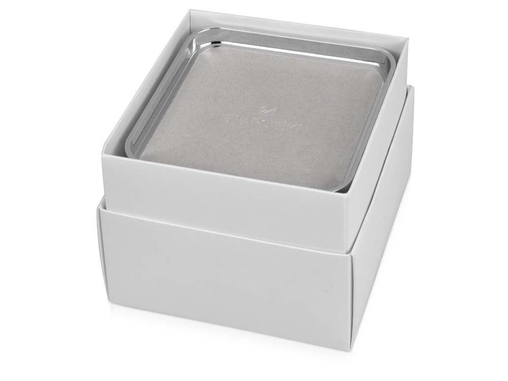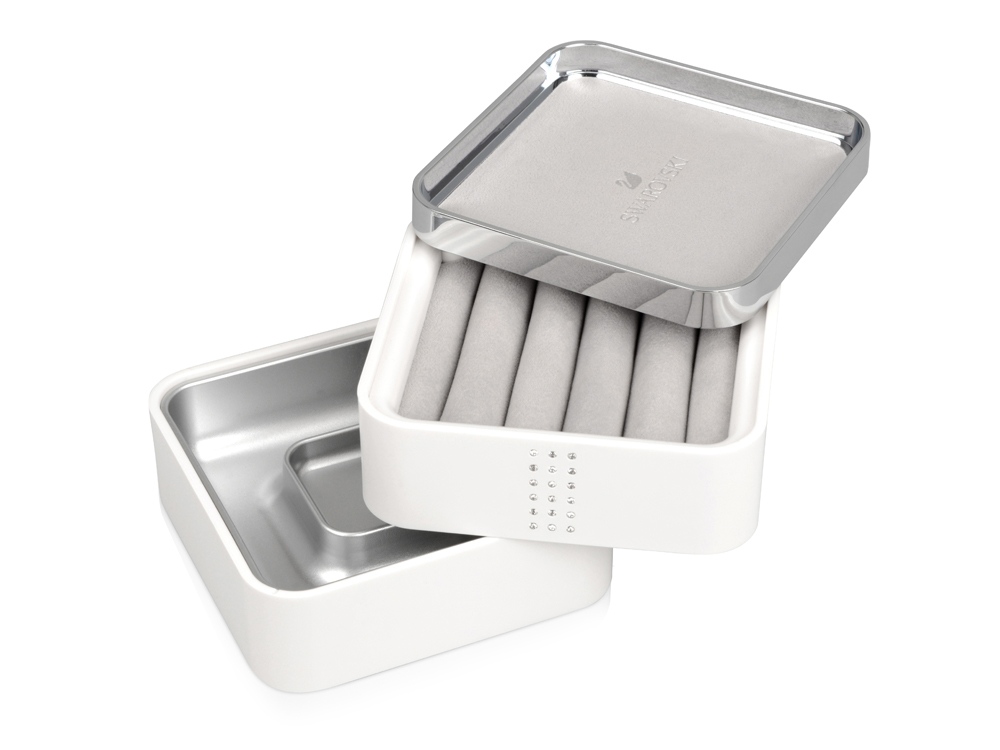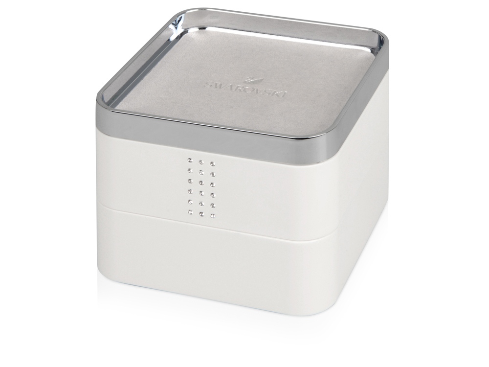 Этот нестандартный подарок не оставит равнодушной ни одну девушку. Шкатулка для хранения украшений от Swarovski® – это красивое сочетание блестящей хромированной крышки, восемнадцати сияющих кристаллов Swarovski® на передней стенке и нежного белого цвета. Необычна конструкция шкатулки – три секции сдвигаются вбок, зафиксированные на одной оси. При желании вы можете нанести на шкатулку свой логотип или надпись.