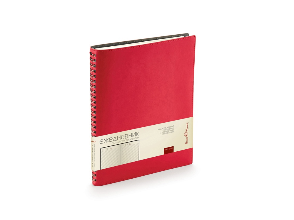 Недатированные деловой ежедневник «Tintoretto». Реальный шов по периметру в цвет материала Гибкий мягкий материал обложки прекрасно подходит для нанесения тиснения. Ежедневники выпускаются в формате В5, его размеры составляют 185 х 230 мм. Блок - 136 листов соединен полускрытым металлическим гребнем. Для блока используется высококачественная бежевая бумага, обладающая плотностью 70 грамм. В начале ежедневника расположены страницы со справочным материалом.