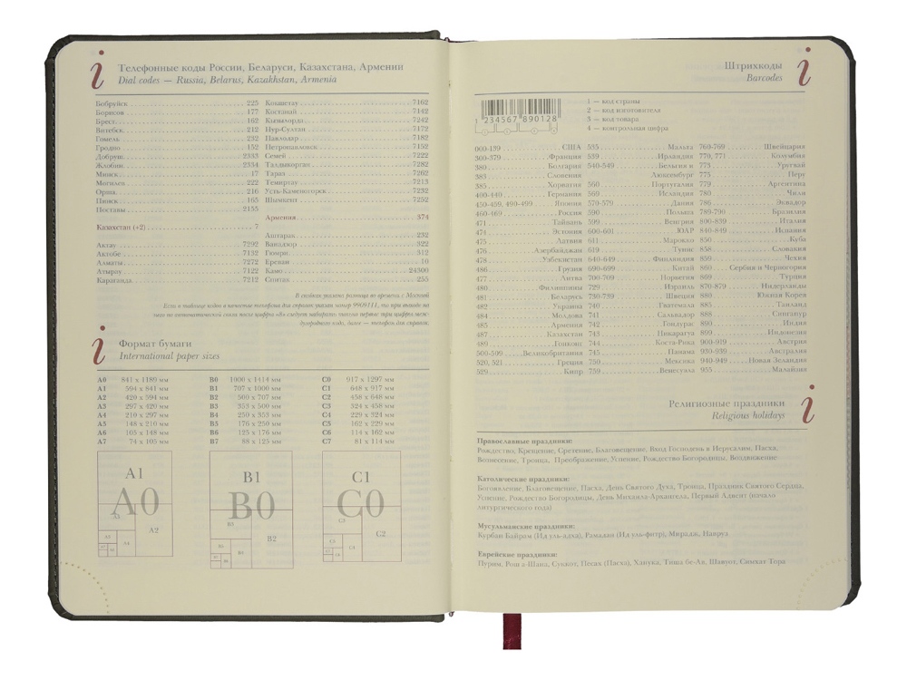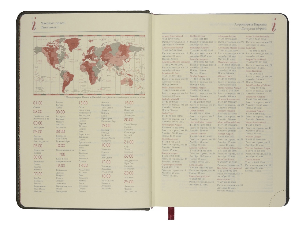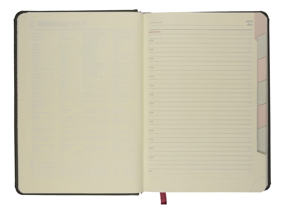 Незаменимый помощник в деле эффективного планирования благодаря высокому качеству производства и тщательно продуманных элементов: мягкая бархатистая обложка со скругленными уголками и строчкой по периметру в цвет, вырубные индексы с цветной маркировкой, разбивающей блок на месяцы, закладка-ляссе, перфорированные углы блока, линовка листов с указанием времени суток.