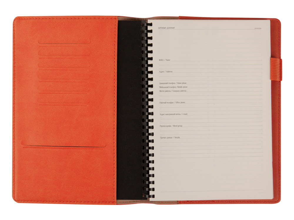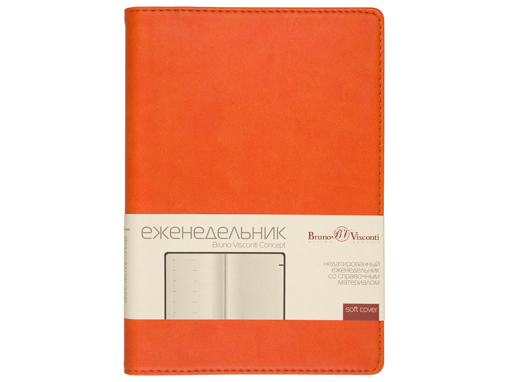 Деловые еженедельники Concept - это воплощение современного дизайна, в котором сочетаются практичные детали. Благодаря удобному формату slim-pocket еженедельник легко помещается в сумку. Еженедельник Concept в классической оранжевой обложке формата А5. Практичный, привлекательный и приятный на ощупь материал обложки на протяжении всего срока службы сохраняет презентабельный вид. Уголки обложки имеют закругленную форму, по всему периметру сделана прострочка нитками в тон. Недатированный блок состоит из 128 страниц, укреплённых на пластиковом полускрытом гребне. На 21 странице размещена справочная информация на русском языке. День недели указан на русском и английском языках. Блок является сменным и вставляется внутрь обложки. С внутренней стороны обложка имеет вырубные отделения для визиток и кредитных карт, а также петлю для ручки на резинке. Для хранения чеков, записок и бумаг внутри расположен прозрачный пластиковый конверт.