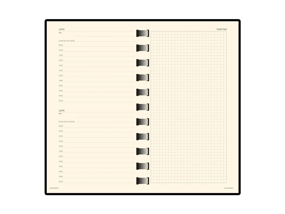 Недатированный ежедневник «Sienna» формата "А5-" итальянский бизнес-сувенир высочайшего качества. Это отличный формат для делового человека: у него есть внутрение кармашки для визиток(5 шт.) и съемный блок на спирали. Сменный блок состоит из листов со справочной информацией (20 стр.), листов в клетку и листов с телефонной книгой (18 стр. в линейку). Персонализировать ежедневник можно с помощью тиснения, металлостикера или гравировки на шильде.