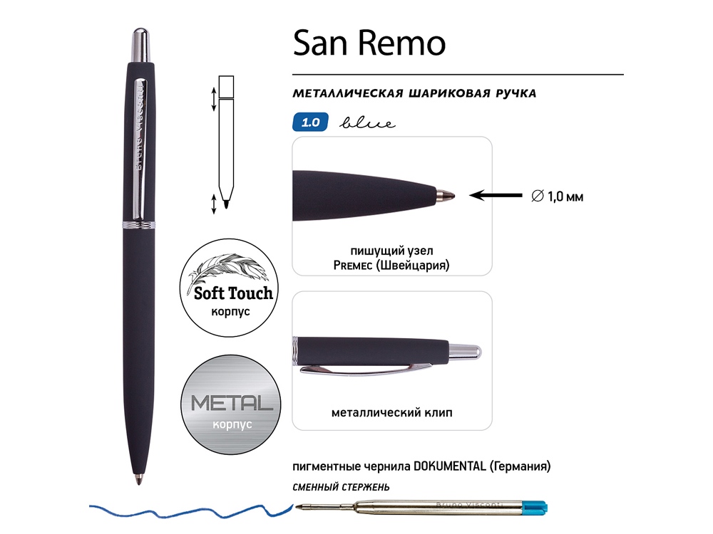 Металлическая шариковая ручка «San Remo» - аксессуар, призванный стать настоящим элементом стиля, подчеркнуть индивидуальность его владельца. Как и все подарочные ручки «Bruno Visconti», «San Remo» - обладательница стержня с пишущим узлом от швейцарского производителя Premec и перманентными чернилами немецкого производителя Dokumental. Поэтому можно быть абсолютно уверенным в качестве письма. Сам стержень легко и бесперебойно выдвигается за счет мягкого нажимного механизма подачи. В ручке нет ничего лишнего, но она привлекает к себе внимание: изящна благодаря плавным линиям, эргономичному корпусу и приятна на ощупь, благодаря покрытию soft-touch. Контраст добавляют кольцо и клип из серебристого металла. Отличный бизнес-сувенир!